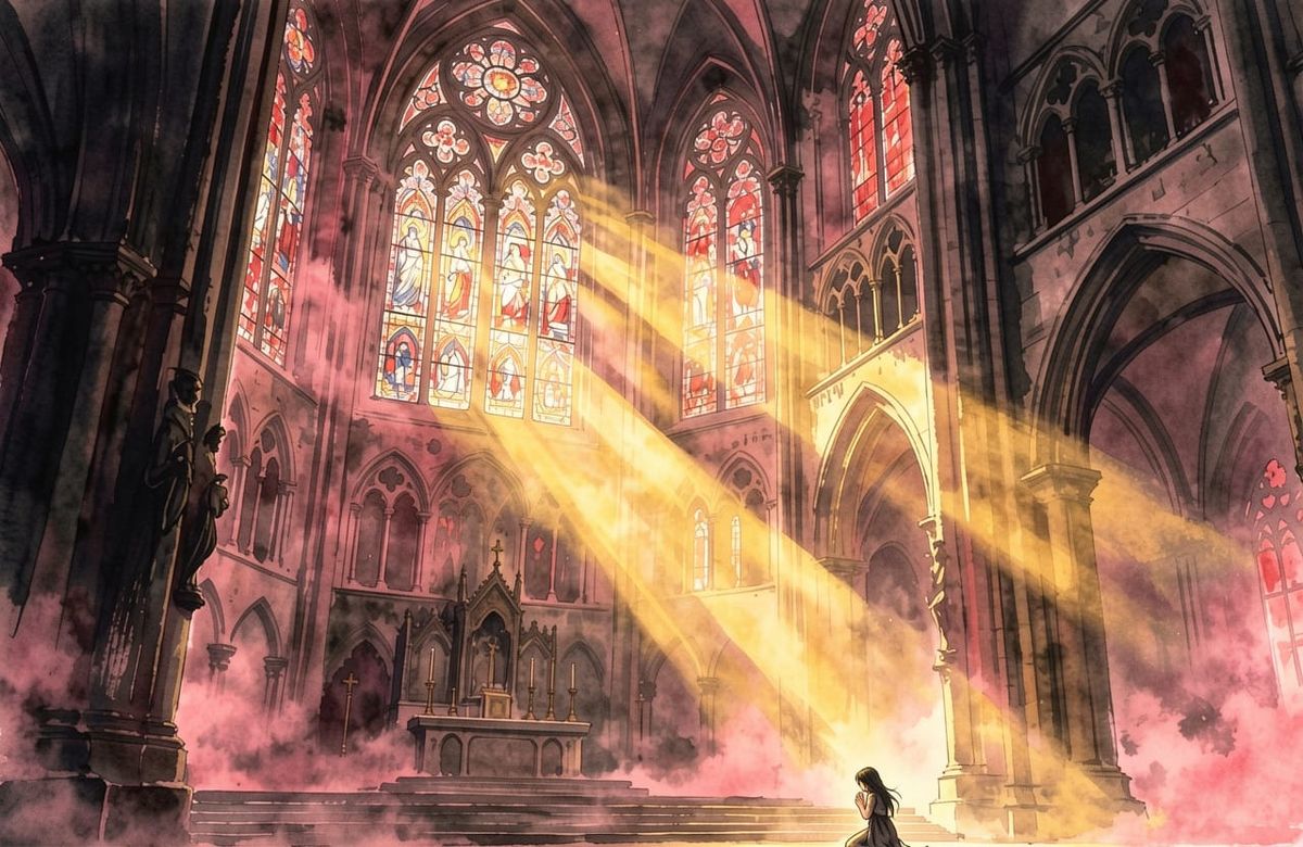 This image features a monumental Gothic cathedral with towering stained glass windows. Cinematic lighting and deep shadows create a dramatic atmosphere, with a small figure kneeling in prayer.