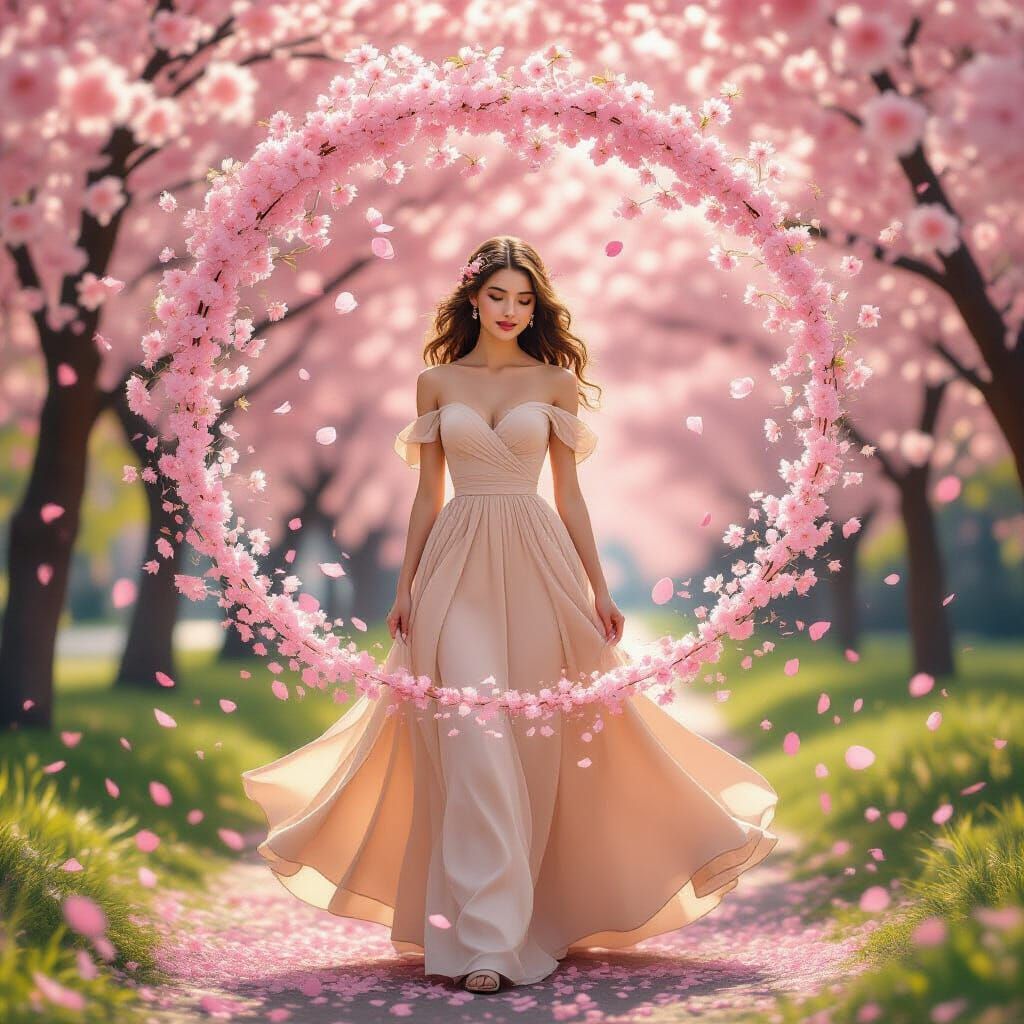 This image shows a woman in a beige dress surrounded by swirling cherry blossom petals. The scene features soft golden hour light and a dreamlike atmosphere, rendered as an ethereal digital painting with pastel gradients and bokeh.