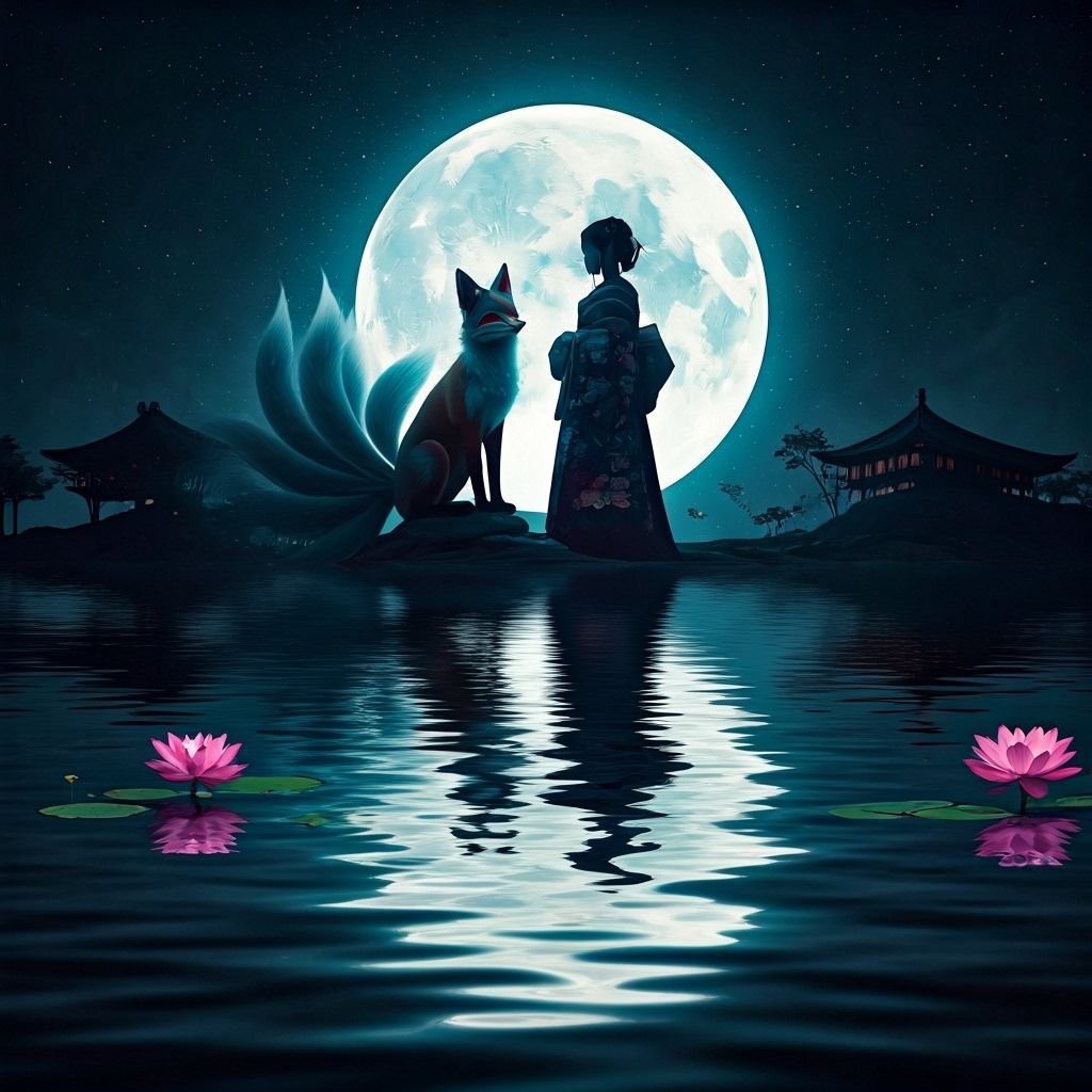 This image features a surreal double exposure of a nine-tailed kitsune and a Japanese princess within a moon, reflected in a pond. It showcases intricate details and high contrast.
