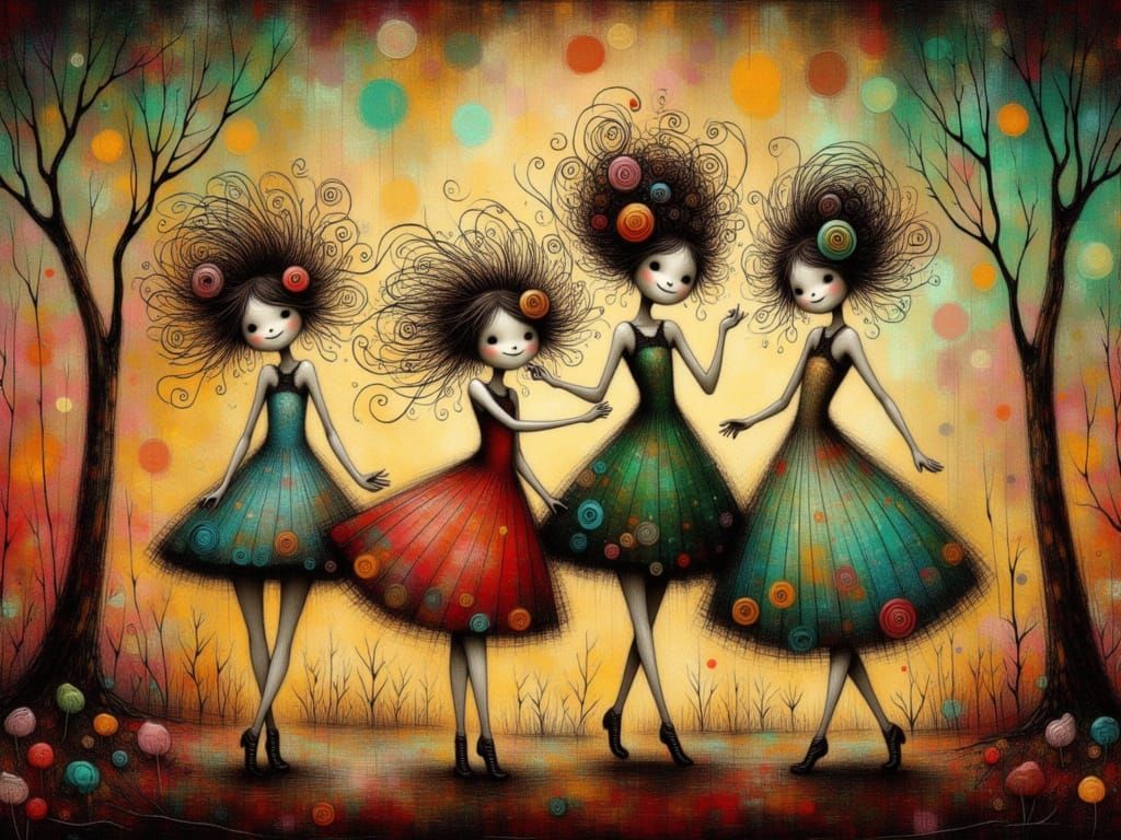 This image features multicolored creatures dancing joyfully in a vibrant, dreamlike landscape. Rendered in an Art Nouveau style with flowing lines and decorative elements.