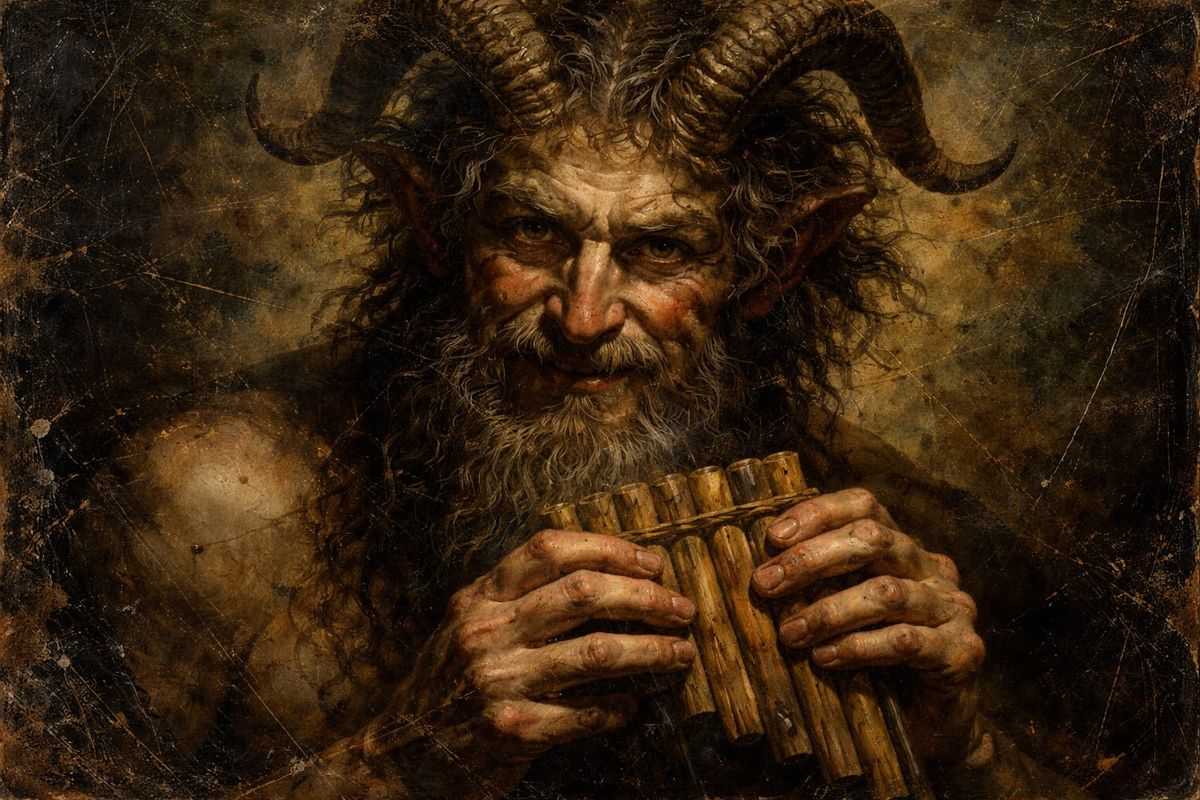 This image shows a detailed portrait of Pan, the Greek god, rendered in an aged oil painting style with visible brush strokes and cinematic lighting.