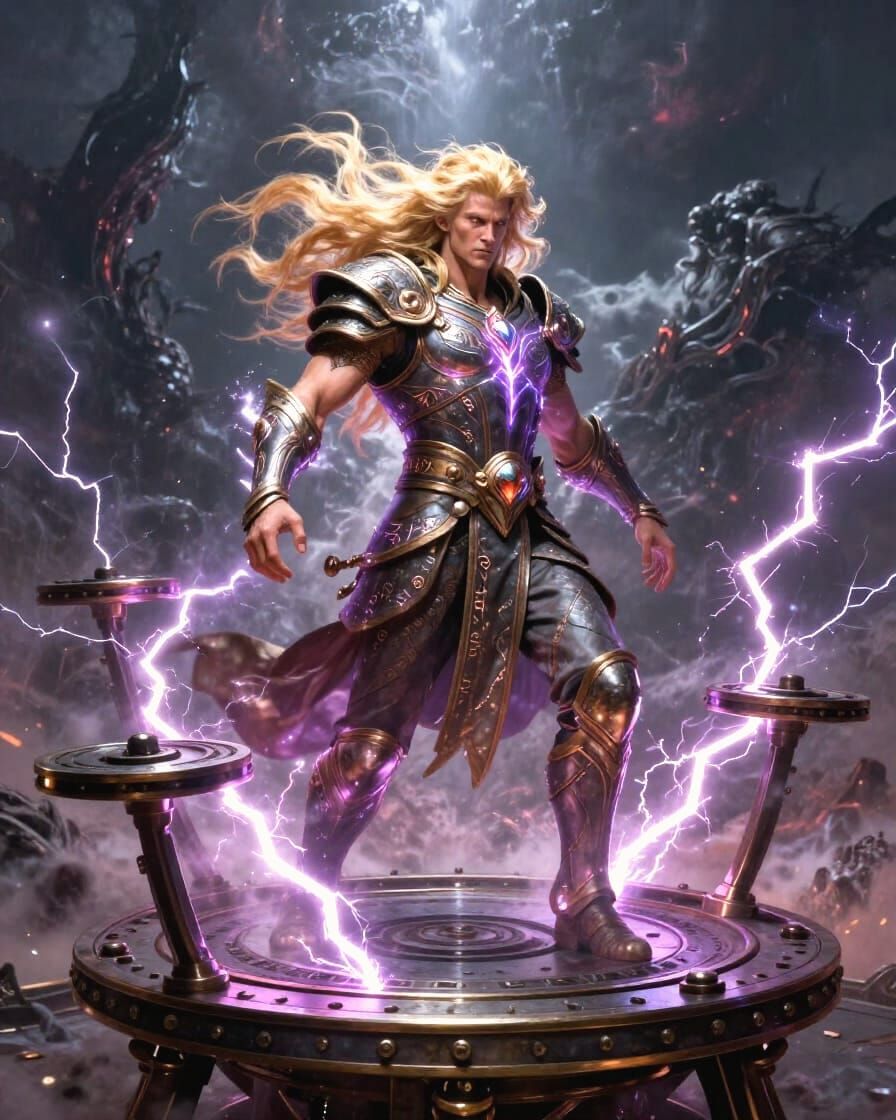This image depicts Torgimbles, a handsome thunder deity with blonde hair, amidst glowing metal gimbals and crackling lightning. Mythic armor and an epic storm create cinematic lighting, rendered in a style reminiscent of classic fantasy art.
