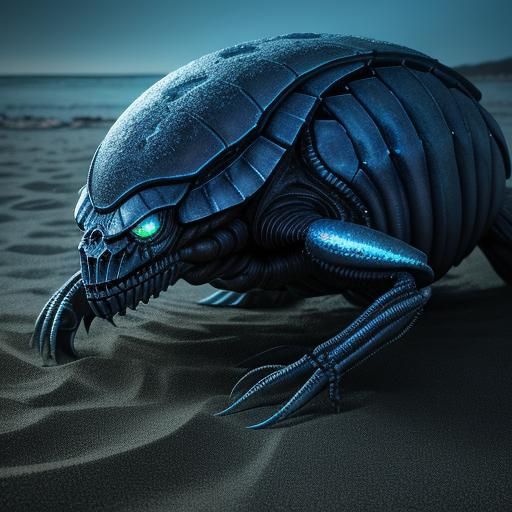 A striking picture of an alien creature resembling a clam burrowing into sand. The close-up shot features bioluminescent highlights, iridescent sheen, and detailed textures in a dark fantasy landscape with Giger-inspired elements.