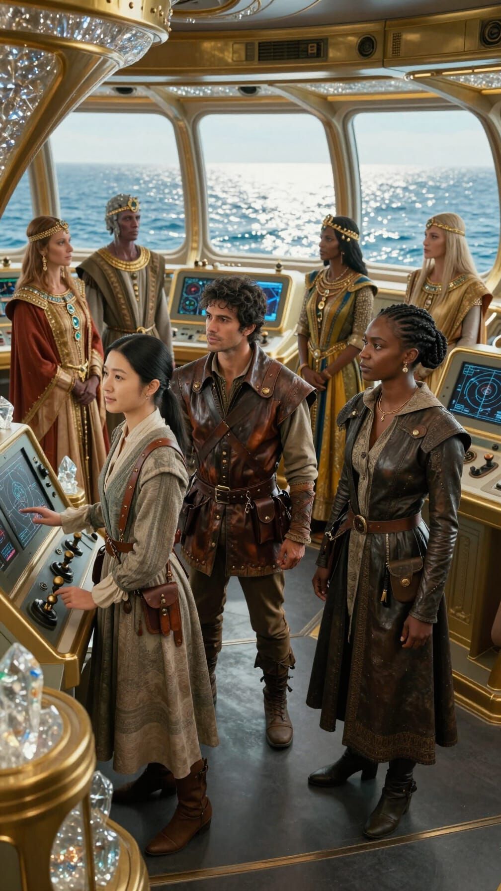 This image depicts explorers from diverse backgrounds in a luxurious cockpit with advanced technology, overlooking a sunlit ocean. The scene evokes awe and anticipation.