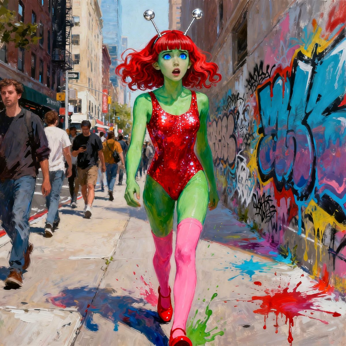 This image shows a young superhero with green skin and red hair walking through a busy city. Rendered in a vibrant graffiti art style with high contrast colors.