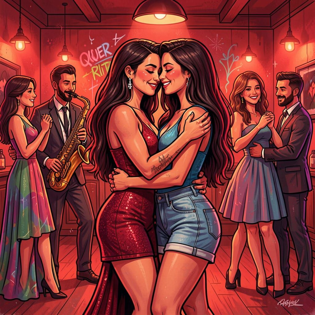 This image shows two women dancing bachata intimately, celebrating queer Latina pride. The artwork features a translucent graffiti style with romantic red lighting and background musicians.