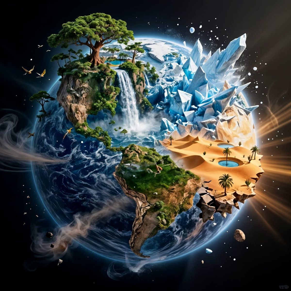 This image depicts a cinematic, multi-biome Earth exploding with life in deep space. It features erupting jungles, blazing deserts, and frozen landscapes colliding dynamically.