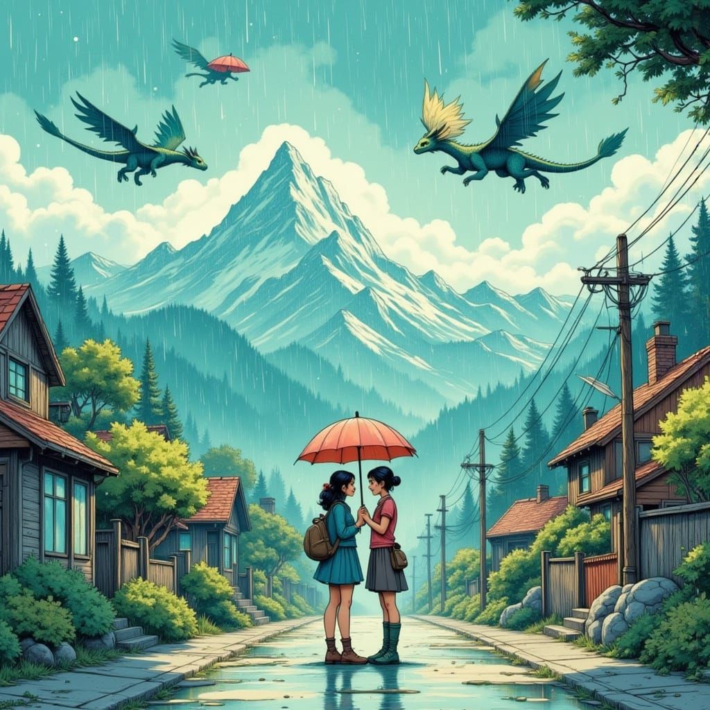 This cartoon-style image depicts neighbors chatting under an umbrella during light rain, with a vast, atmospheric sky featuring dragons and mountains above a quiet street.