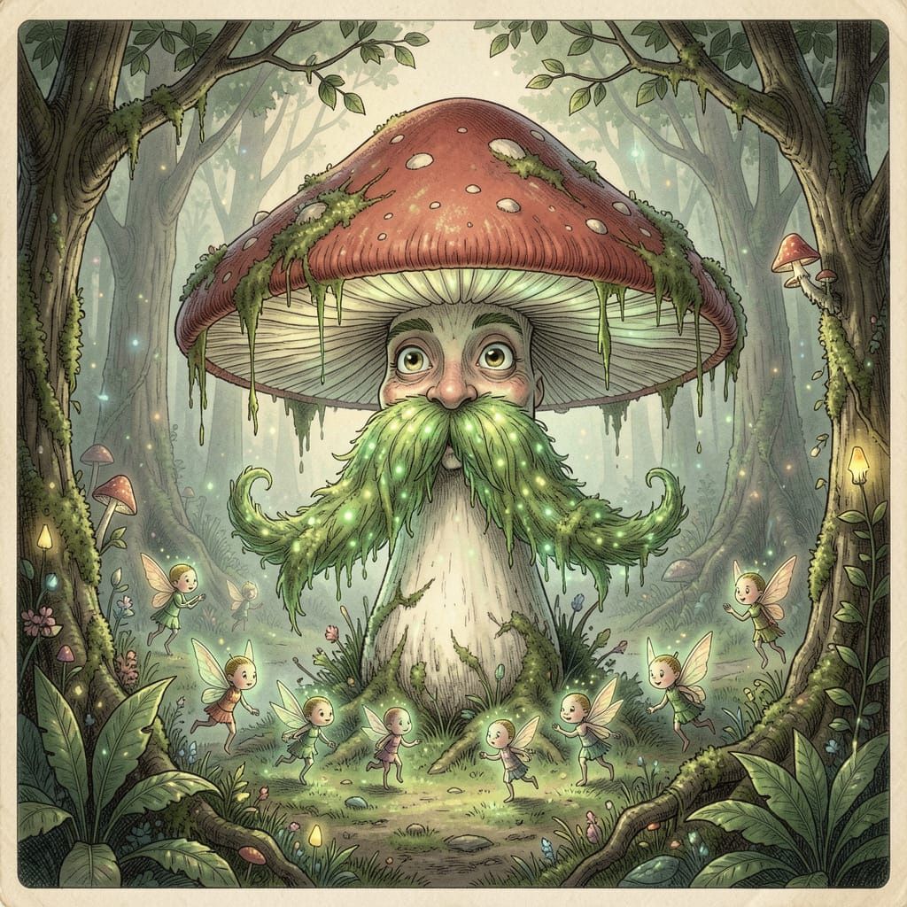 This image depicts a fantastical, oversized mushroom with a glowing moss mustache, set in a mystical forest clearing with tiny sprites. Rendered in the style of vintage botanical illustrations, it evokes an ethereal, imaginative atmosphere.