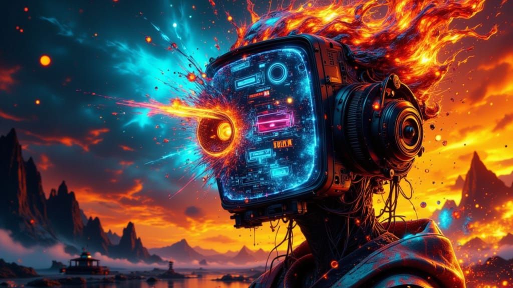 A hyperdetailed concept art portrait of a TV-Head character. Features dynamic lighting and splash art elements, rendered with intricate detail for a striking visual.