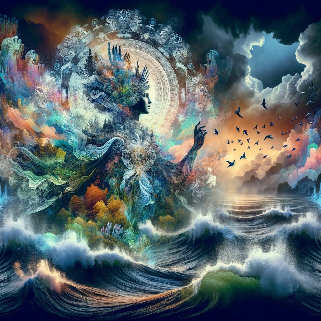 This hyper-realistic image showcases a sea goddess emerging from stormy waves, blended with a magical forest spirit. A maximalist, optimistic vision of fantasy and nature.