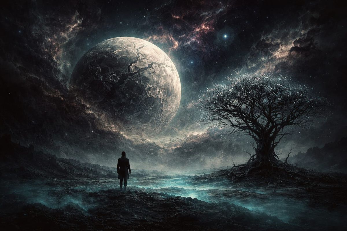 A lone figure stands in a dark, atmospheric fantasy scene. A giant, cracked moon glows above swirling nebulae, with a gnarled tree and bioluminescent mist on a desolate plain.