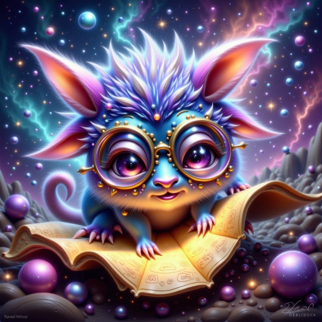 This image shows a fluffy cosmic creature wearing large, gem-studded glasses and studying an ancient map with glowing symbols. The scene features a nebula background with soft light and shimmering dust, rendered as detailed digital concept art.