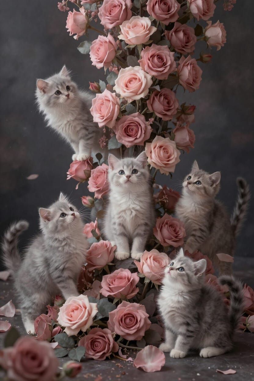 This image showcases whimsical kittens playfully interacting with a cascade of roses. Rendered with delicate detail and atmospheric lighting, it evokes a dreamy, sophisticated feel.