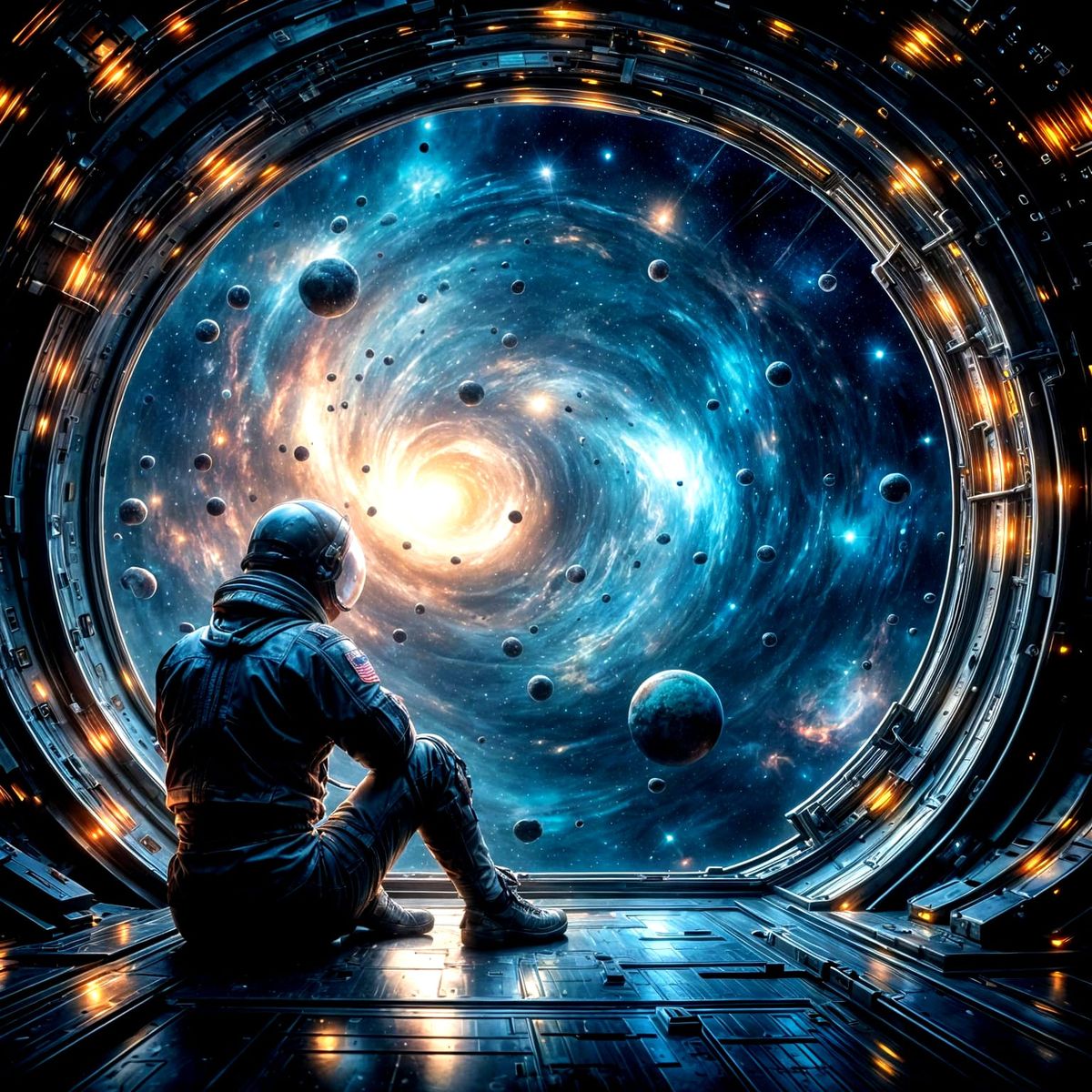 This image shows an astronaut watching a vibrant, star-filled nebula from a spaceship. Reflections appear on the viewport, with soft lighting creating a peaceful scene. Rendered with antique watercolor and impasto techniques.
