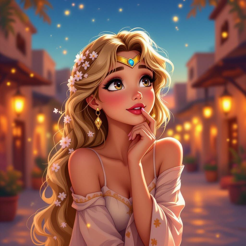 This image depicts a princess in a Moroccan market at dusk, with flowers in her hair and a dreamy gaze. Features warm lighting and a magical realism aesthetic.