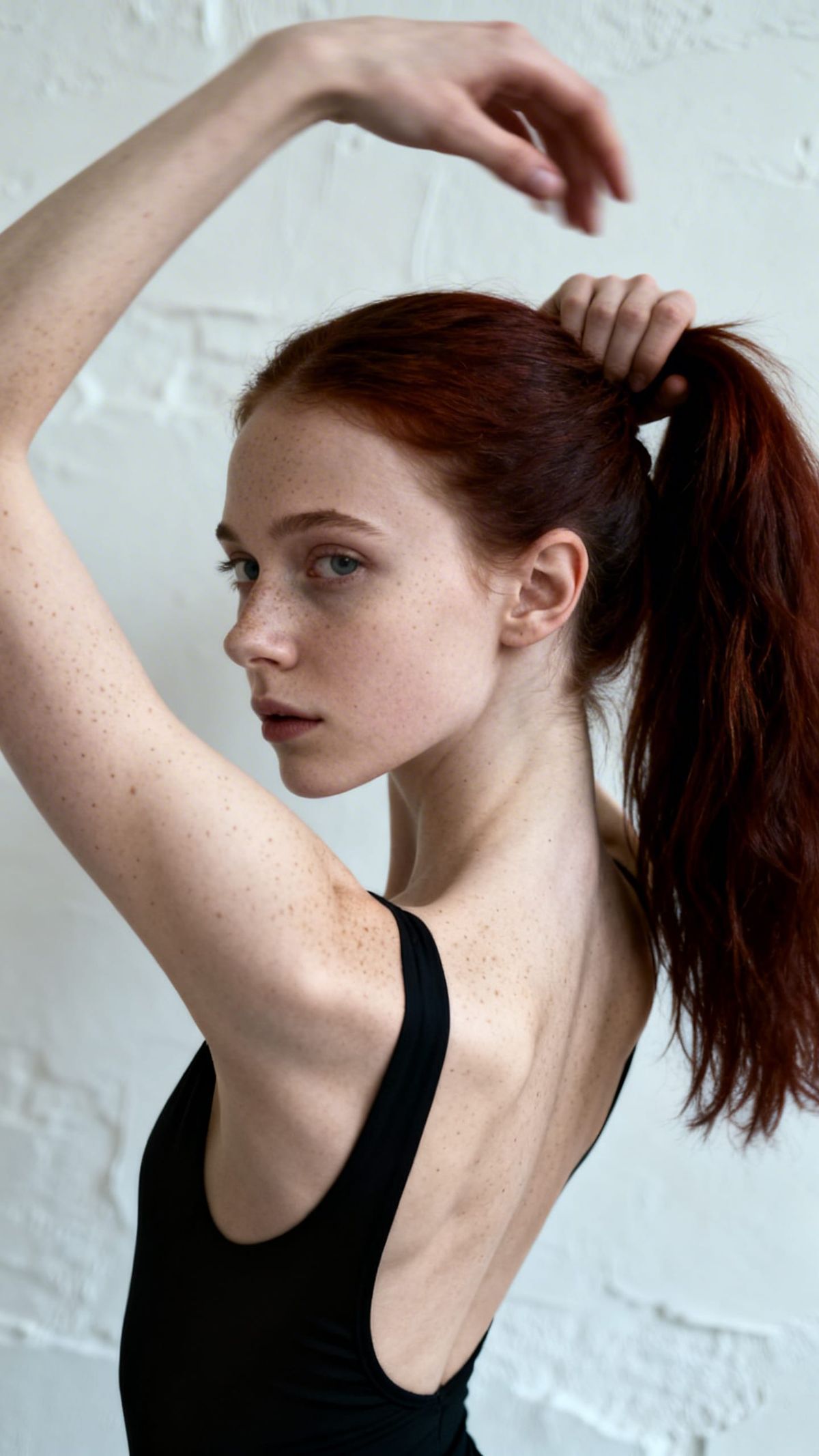 A hyper-realistic portrait of an elegant Nordic woman in a backless dress, showcasing intricate skin detail and a graceful pose. The image features studio lighting and a tilt-shift effect for layered depth.
