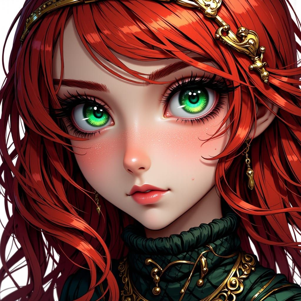 This image depicts Mia Potter with red hair and green eyes, styled as an anime character. Features abstract vector fractal elements and 3D shading.
