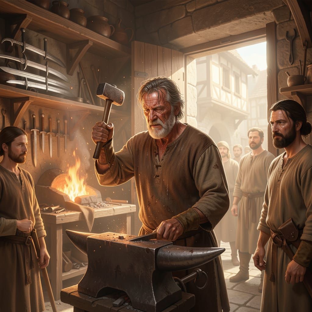 This image shows a grizzled blacksmith forging metal at a roaring fire in a busy medieval city. Customers wait outside as sunlight illuminates the dusty, hazy air, showcasing realistic fantasy style with dramatic lighting.