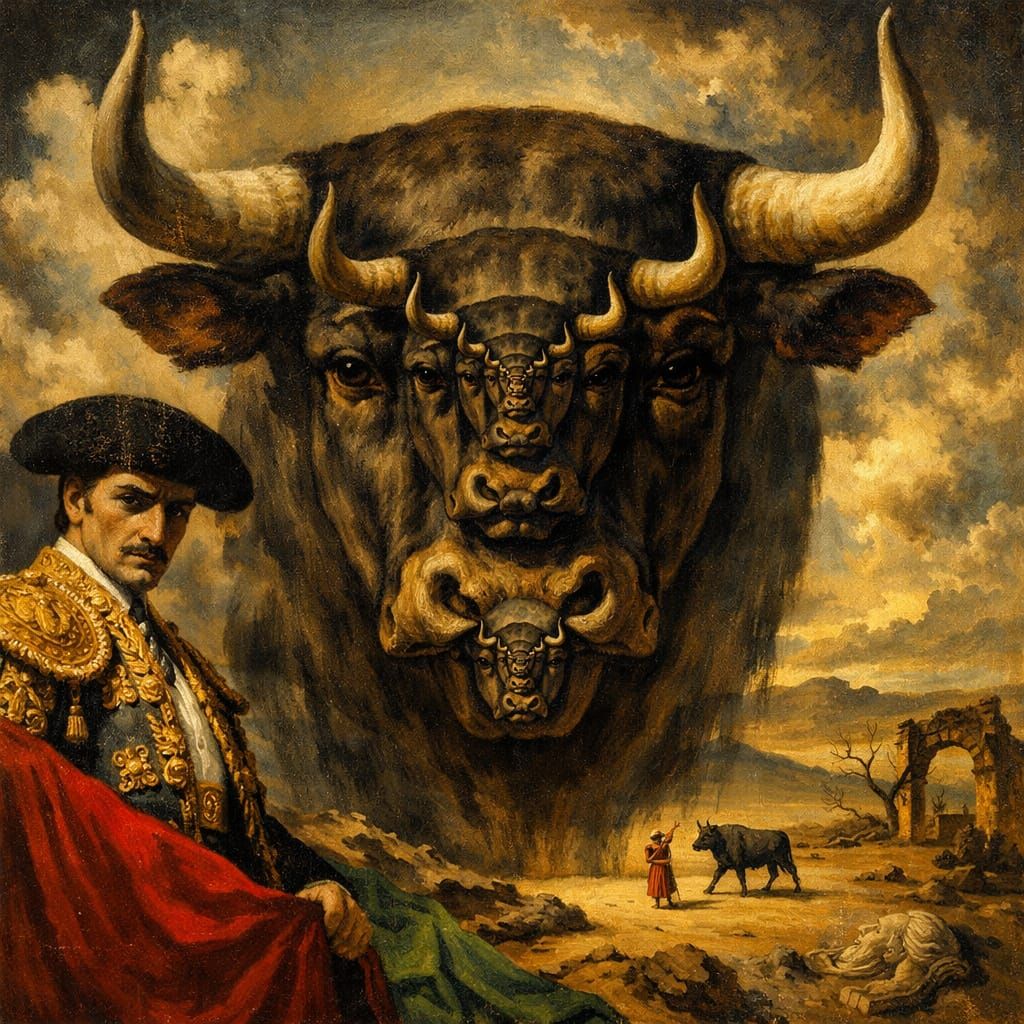 This image depicts a bullfight scene, merging the surreal style of Dali with intricate fractal patterns. The artwork features nesting bulls and a self-reflexive design.