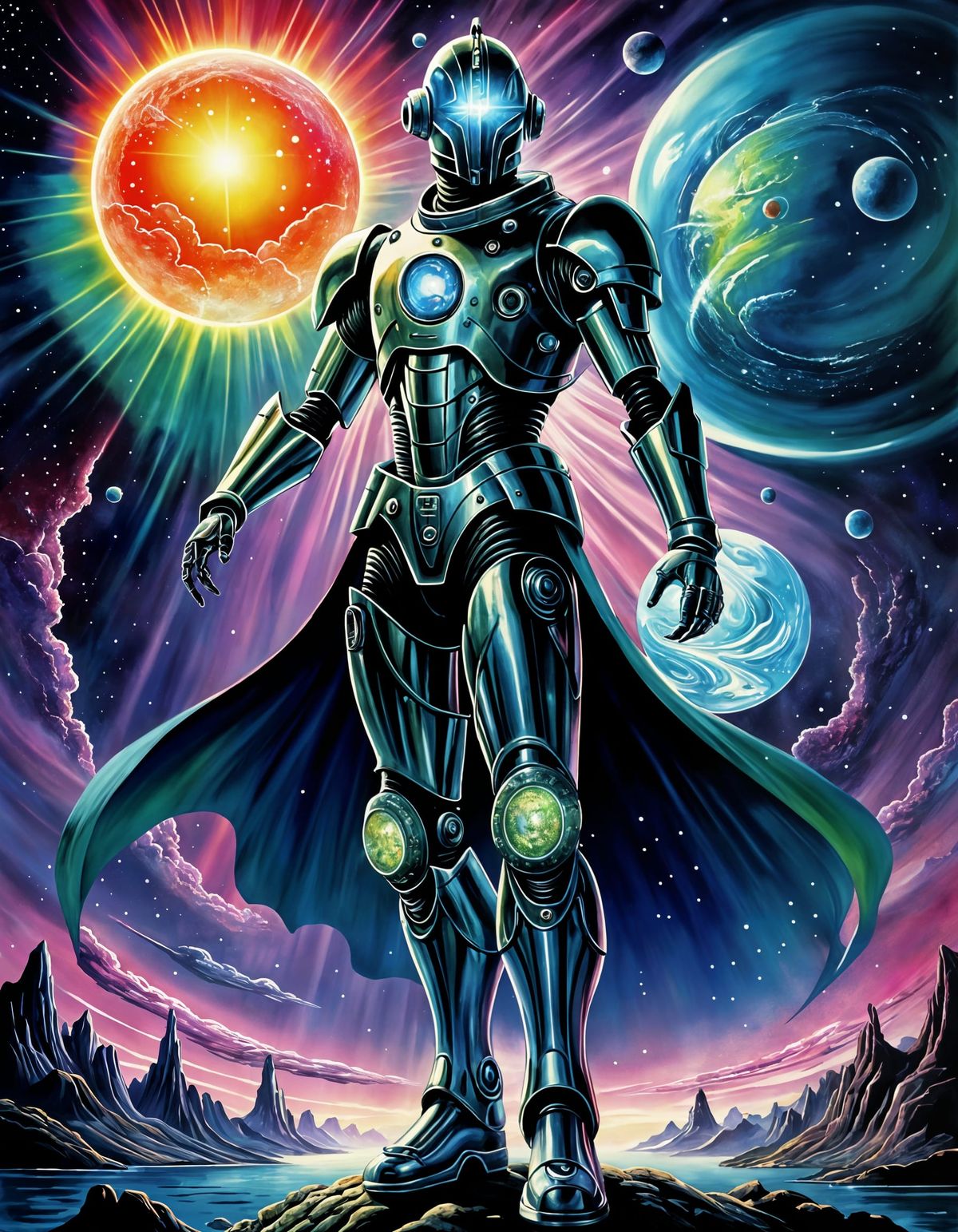 A detailed sci-fi surrealist poster featuring a gleaming cyborg genie in armor. Set against a cosmic aurora borealis background with vibrant lighting, in a retro-futurism style.