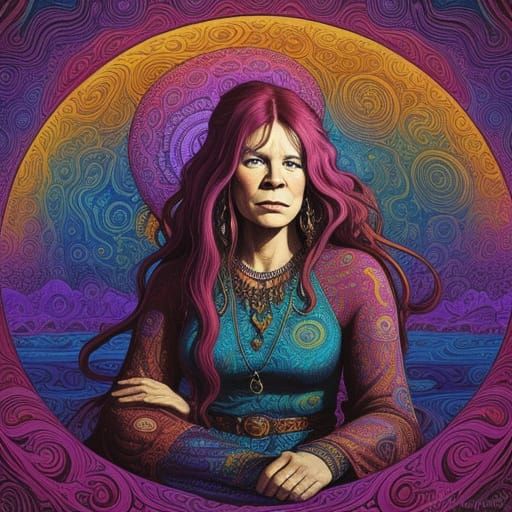 Generate your own psychedelic rock art images with our free AI image generator, featuring iconic musicians like Janis Joplin in vibrant, colorful scenes.