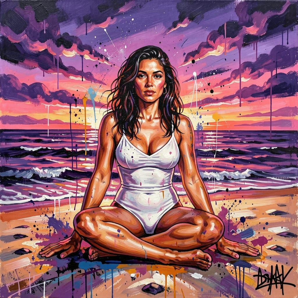 This image shows a woman in a white swimsuit on a deserted beach during a vibrant purple and pink sunset. The art style combines graffiti, splash, and street art with rich media textures.
