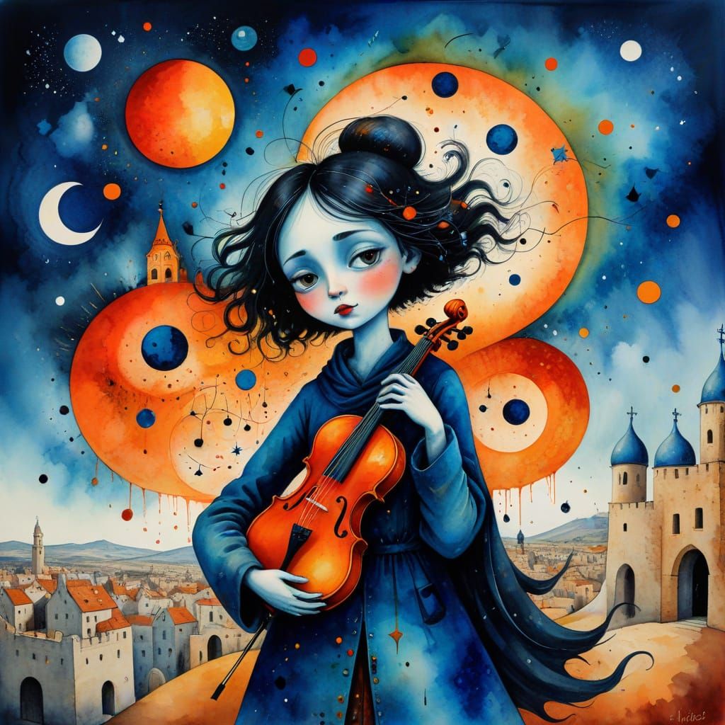 This image shows a surreal watercolor and ink painting of a doomed Jerusalem. It features vibrant colors, intricate linework, and glowing embers, evoking emotional and whimsical details.