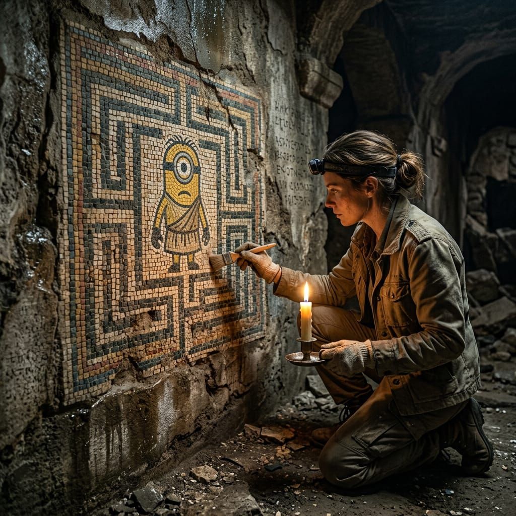 This image depicts an archaeologist discovering a faded mosaic of Minion Kevin within an ancient tomb. Cinematic lighting highlights textures in a style reminiscent of Caravaggio and da Vinci.