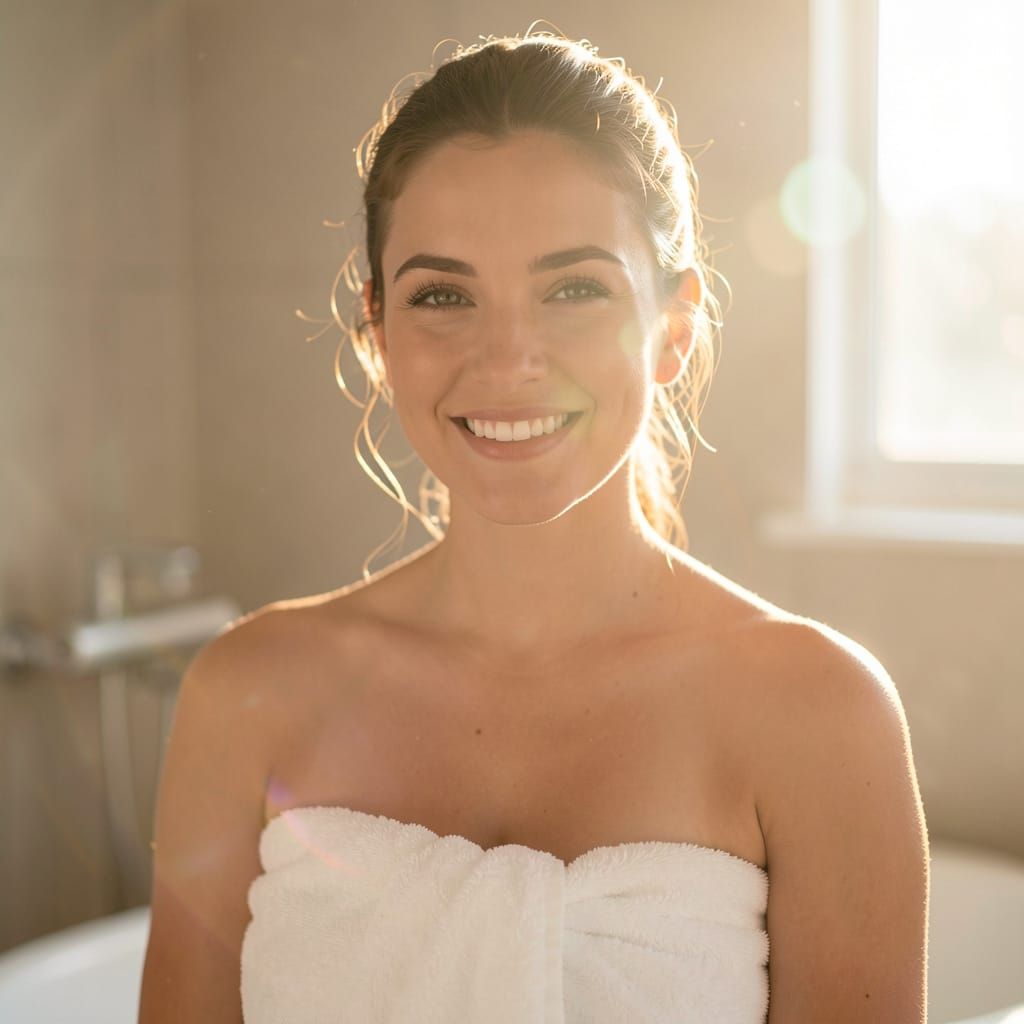 This image shows a woman with a radiant smile wrapped in a white towel, bathed in soft, golden hour light. Captured with cinematic photography, it features a shallow depth of field and subtle lens flare.