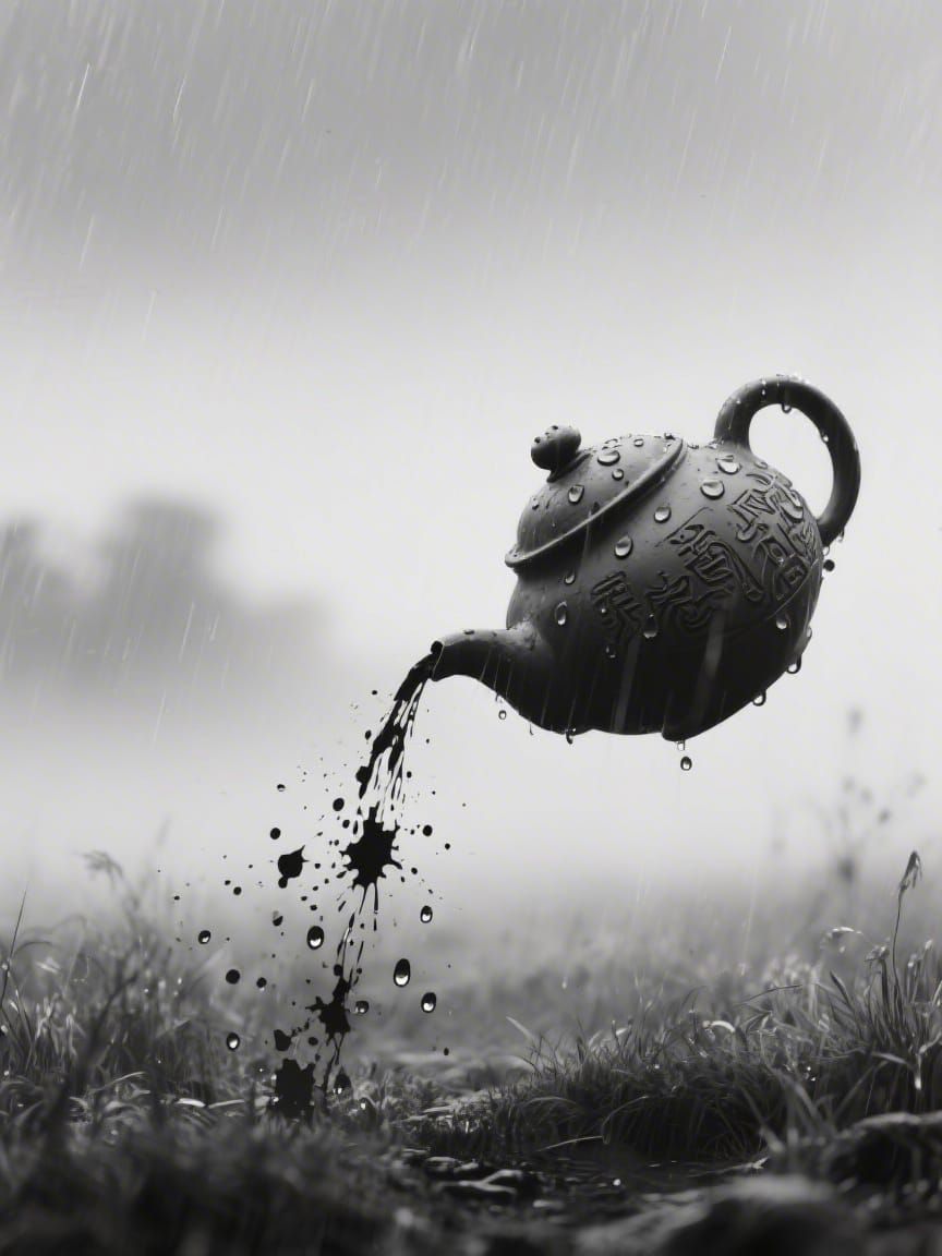 This image depicts ancient wisdom flowing from a teapot in a serene, monochromatic glade, with ink splatter rain and mist creating a tranquil atmosphere.