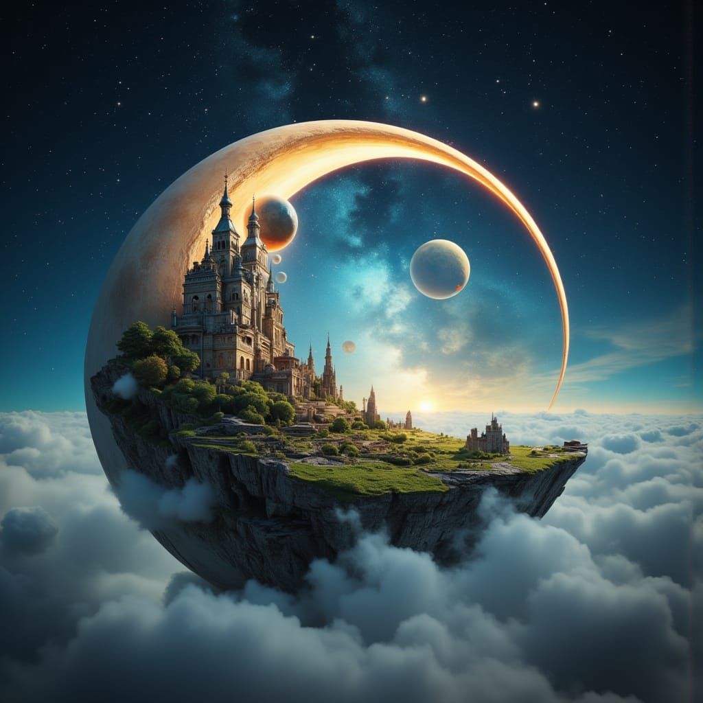 This image shows a miniature city resting on a crescent moon in a surreal dreamscape. The scene is backlit by a vibrant, star-filled sky, rendered with HDR processing for an otherworldly effect.