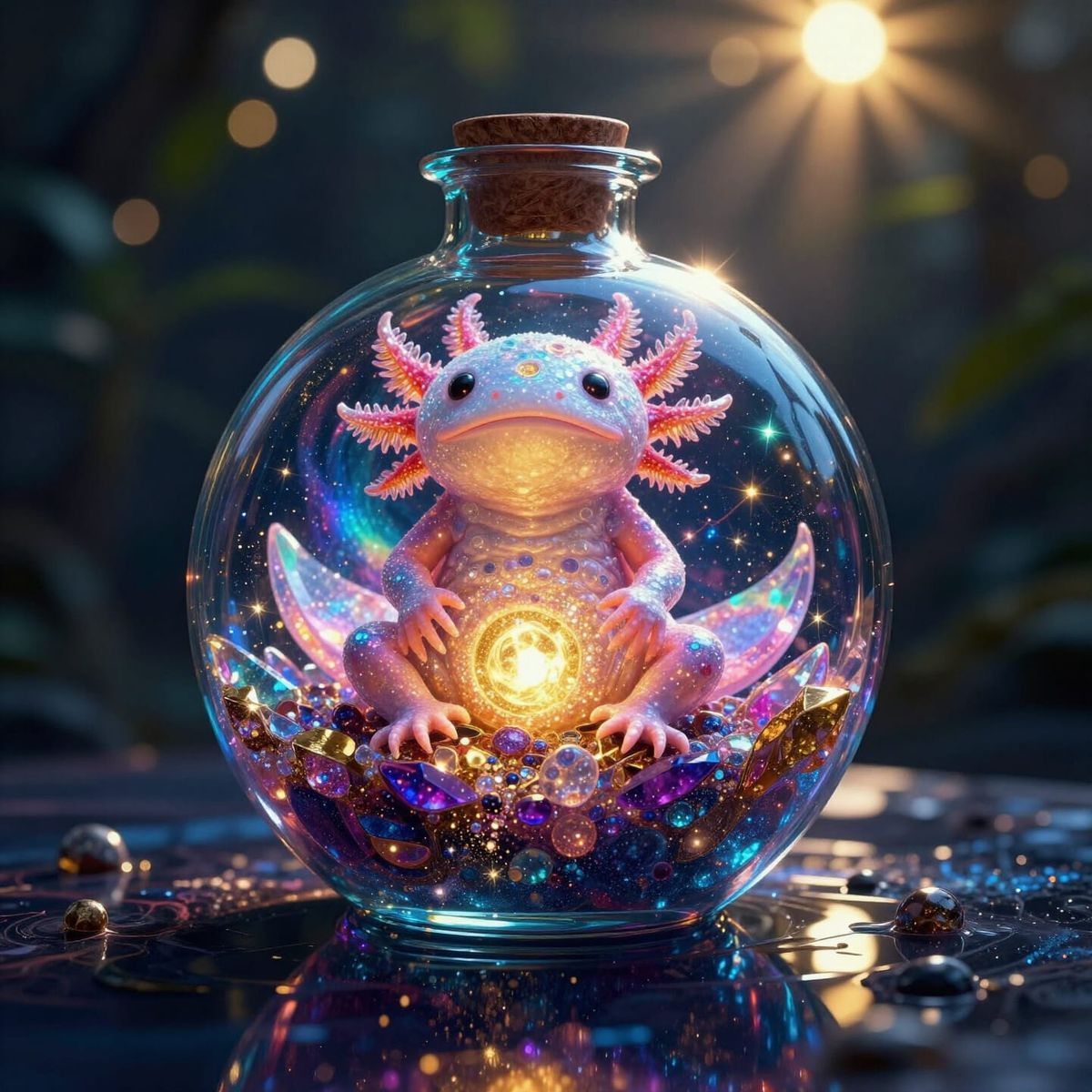 extremely detailed photography perfect closeup of a fantasy futuristic colossal potion,inside is a colorful illuminated glowing sparkly crystal glittery meditating axolotl xenomorph mutate, filled with gold moonbow Rainbow crystal marble galaxies and constellations liquids,shadow pattern,sunbeams,golden ...
