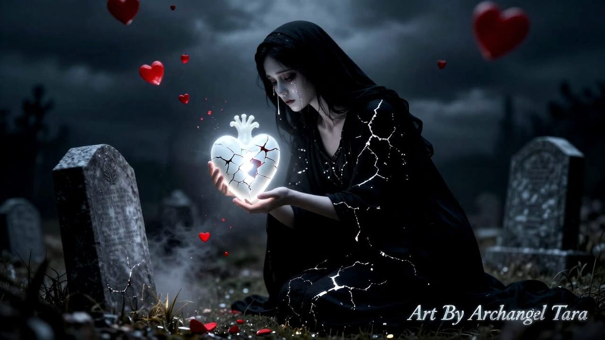 4/5/2026-Masterpiece high-resolution surreal fractured art: a ghostly pale woman in flowing black mourning attire kneels at a freshly turned grave be......Art By Archangel Tara