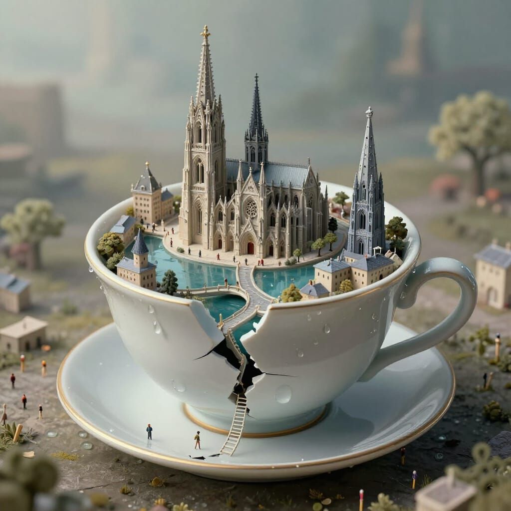 This image shows a miniature Gothic city constructed on a giant, cracked teacup, featuring intricate cathedrals and towers. The surreal style is enhanced by dreamlike lighting and a muted color palette, creating a whimsical yet eerie atmosphere.