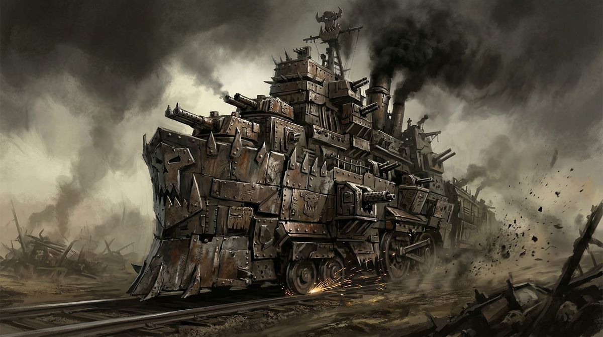 This image depicts an epic Ork war train designed as a brutal armored battleship, a scrap-built locomotive resembling a warship sailing on land with chaotic welded metal and layered armor plates.