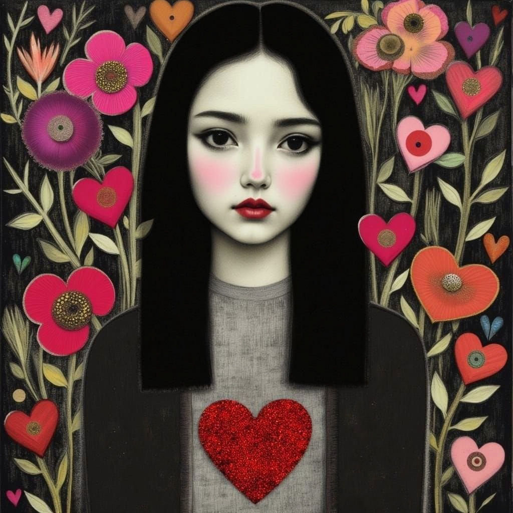 "a thoughtful woman in a dark world with a glittering red love-heart in her chest. a touch of Yuko Tatsushima's visceral paintings that explore themes of mental anguish, traumatic loss, and despair. collage of hearts and flowers. <lora:mmcollage:1.0> <lora:Heart Work:1.0> <lora:AmongTheDark:1.0> Replace with background colour."
