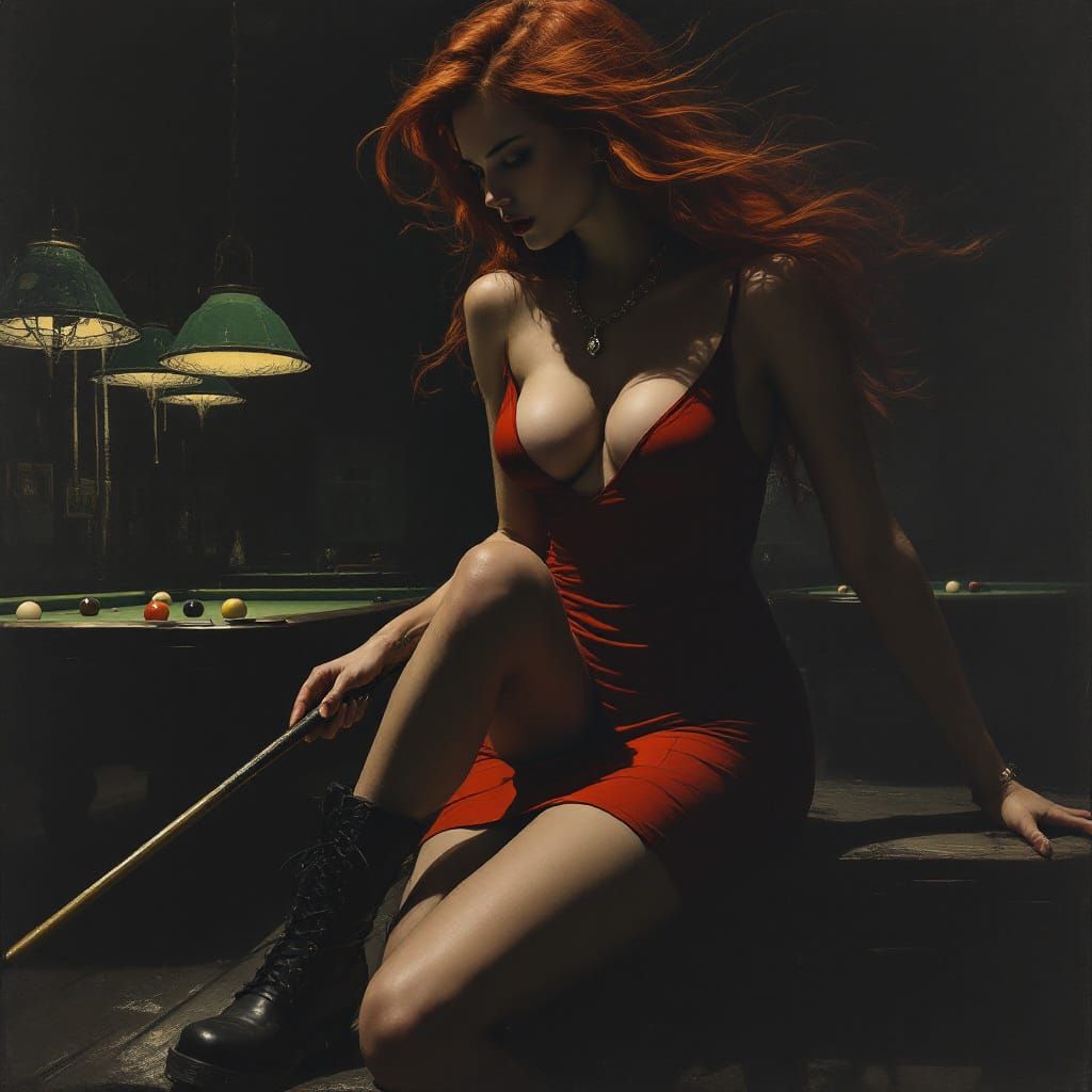 A confident woman with red hair in a red dress and boots holds a pool cue in a dimly lit pool hall, rendered with sharp contrasts and graphic clarity.