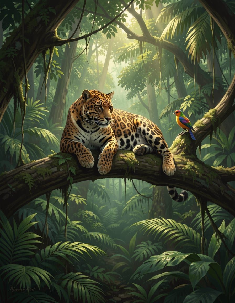 A hyperrealistic digital painting shows a jaguar resting on a tree branch in a lush, sun-dappled forest. A small bird is nearby, creating a scene of calm yet tense beauty with moody lighting and rich colors.