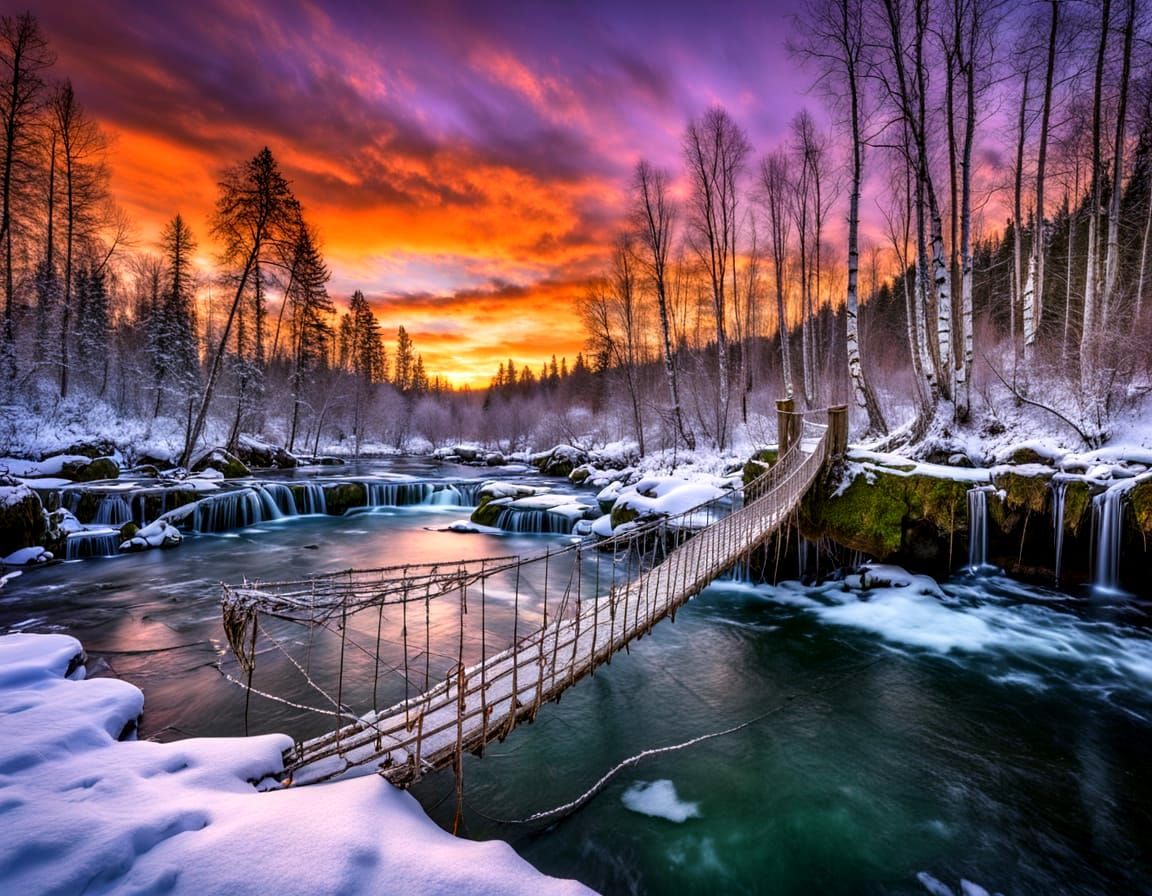 This image showcases a rope bridge over a frozen lake, with a waterfall and colorful trees under a vivid sunset sky. Captured with high dynamic range.