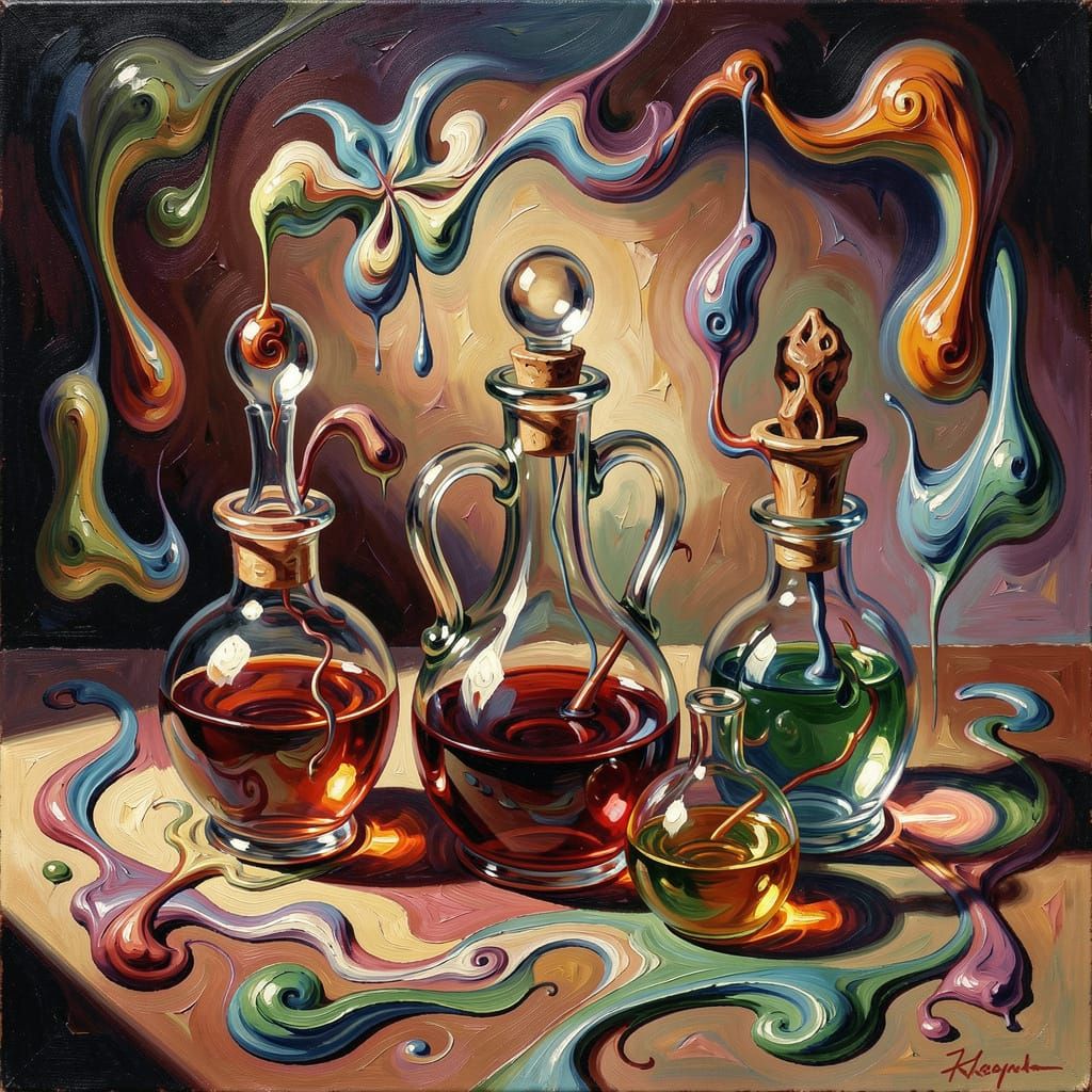 This image depicts a surreal still life of potion bottles with a melting background, rendered as an oil painting with impasto textures and dramatic lighting.