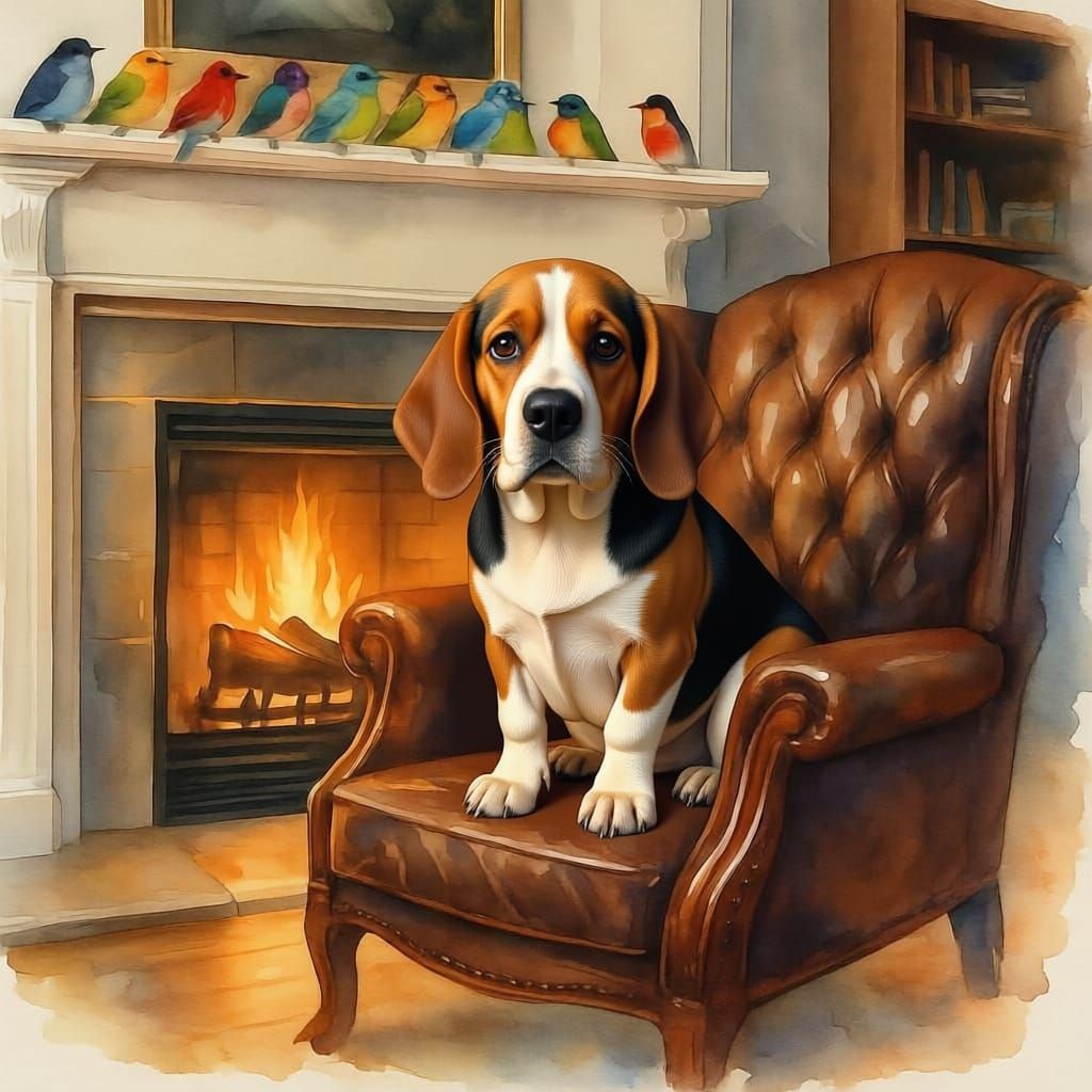 This image shows a proud grey Siamese cat by a warm fireplace. Colorful birds perch on the mantelpiece, adding brightness to the detailed matte painting style scene with dynamic colors.