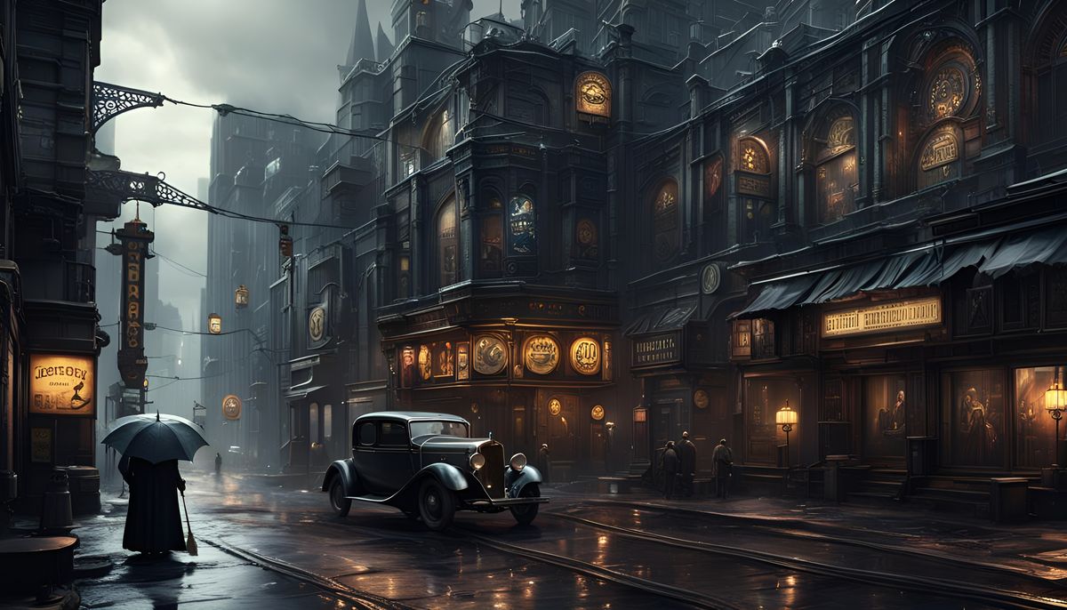 A captivating view of a city blending gothic, art deco, and dieselpunk elements. The image evokes Tim Burton's Gotham, with electric signs and intricate details in a dark, brooding, fantastical style.