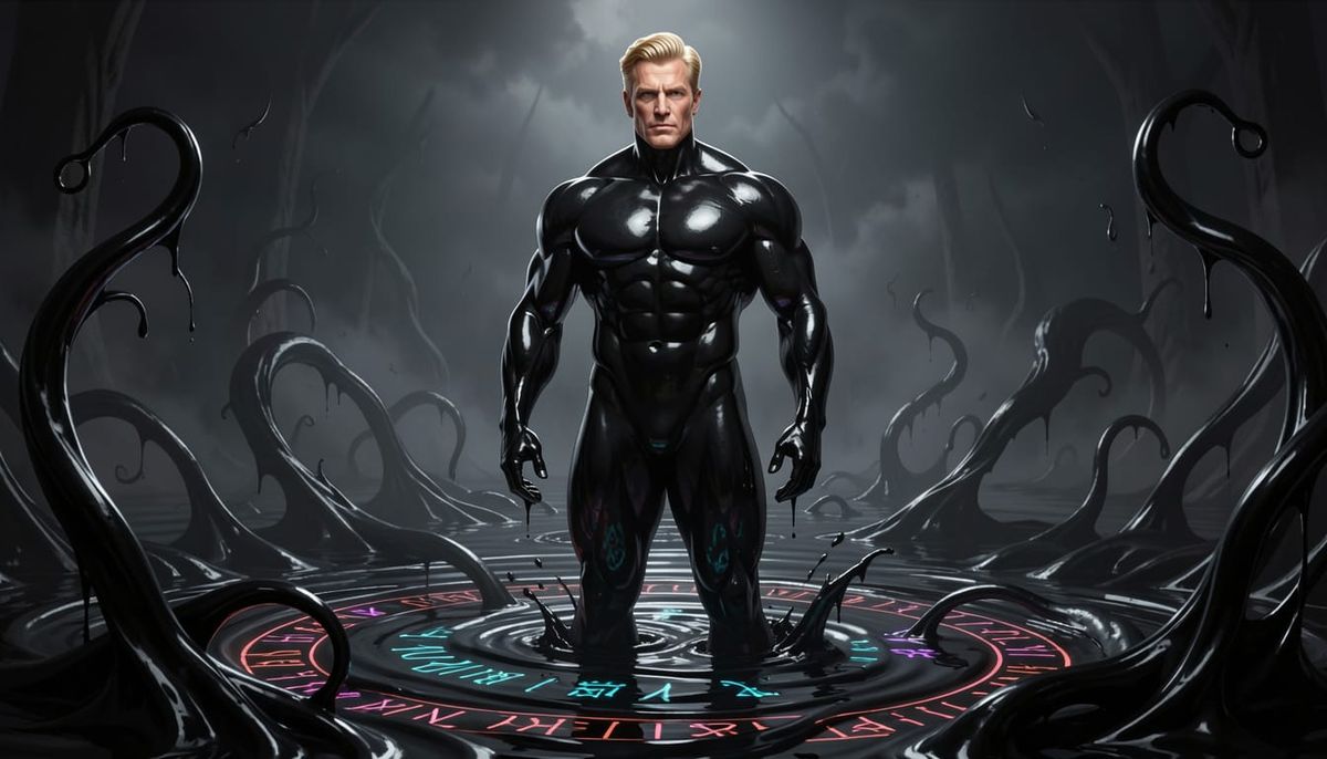 A hyperrealistic digital painting of a muscular man covered in dark liquid latex, standing in a magical lake. Dramatic lighting highlights the latex's sheen. Arcane details enhance the dark, mystical atmosphere.