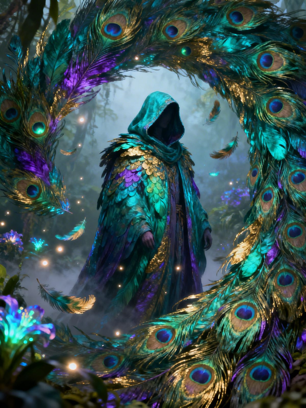 A hyper-detailed fantasy realism digital painting of a cloaked figure adorned with shimmering peacock feathers in a misty, bioluminescent jungle. Glowing eyes and floating feather motes add to the mystery.