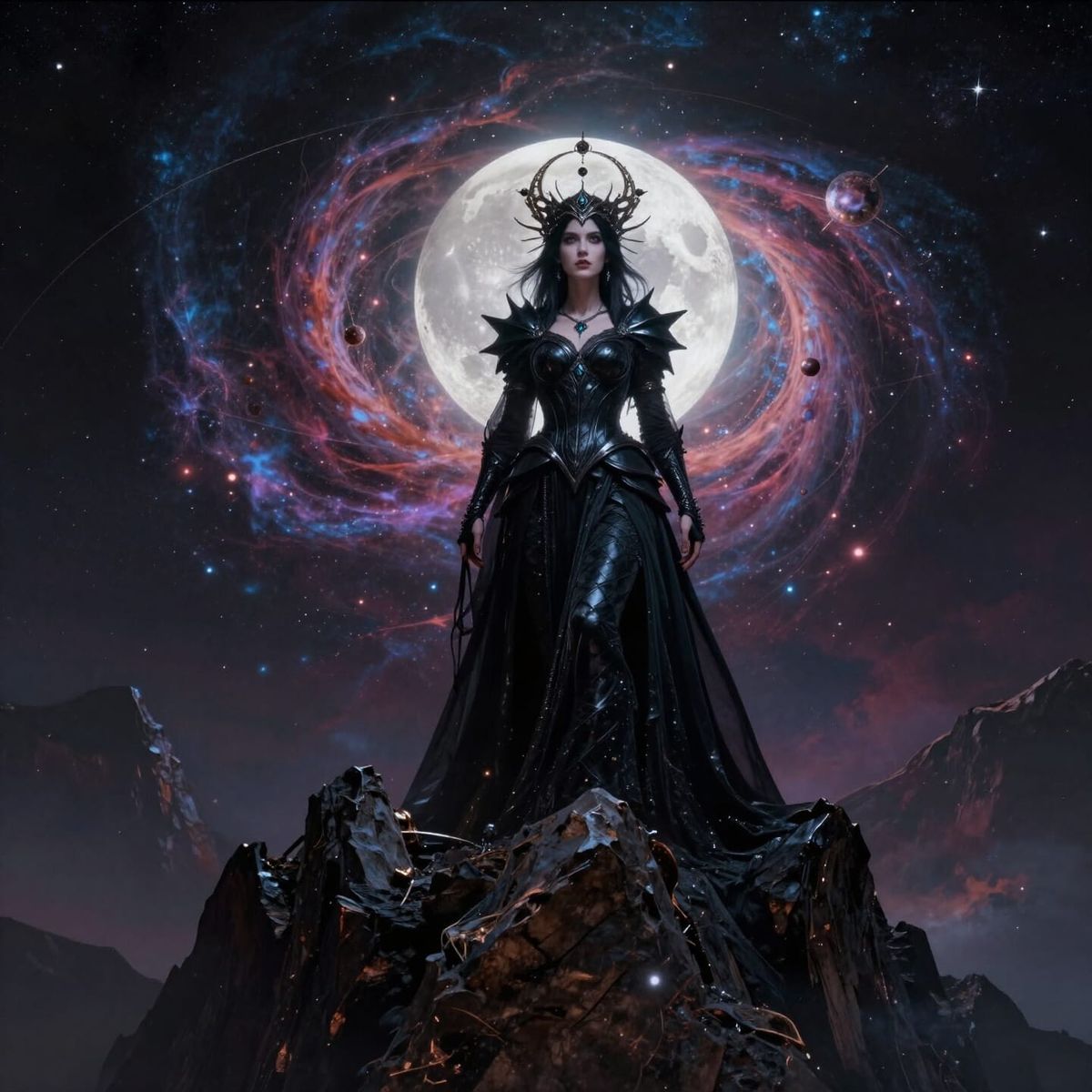 This image shows a powerful sorceress in obsidian armor on a mountain peak, looking at a swirling nebula. Illuminated by moonlight, she is surrounded by celestial bodies, presented in a dark fantasy concept art style with psychedelic influences.