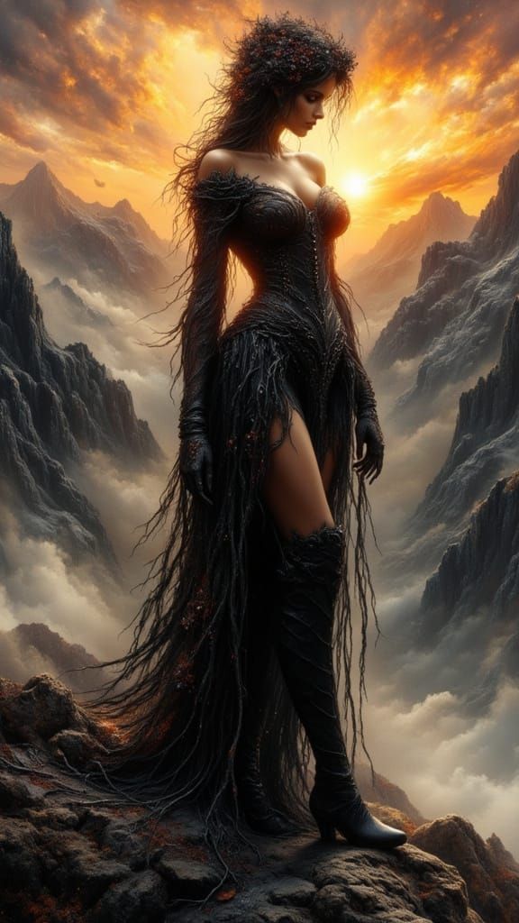 This image features a woman in a dark, ornate corset and boots against a sunset mountain backdrop. The collage style creates depth with a surreal, dreamlike atmosphere and soft lighting.