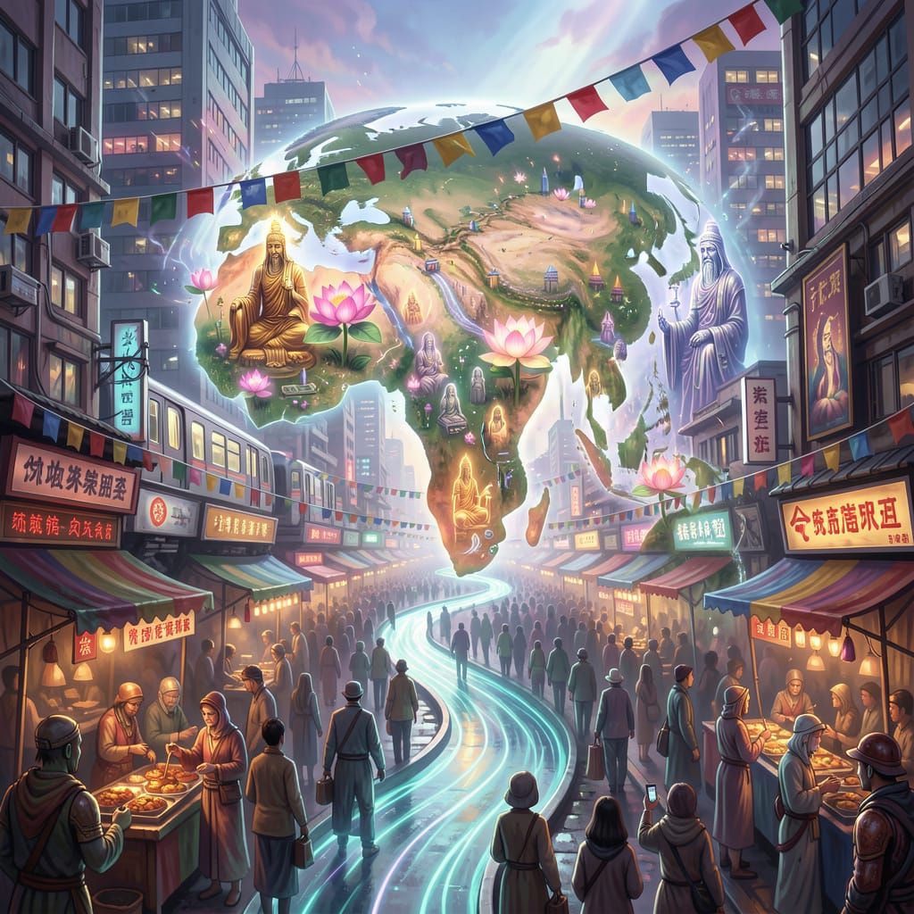 This image shows a vibrant Asian city where ancient spiritual elements merge with modern life, rendered in a dreamlike, painterly fantasy concept art style with dramatic lighting.