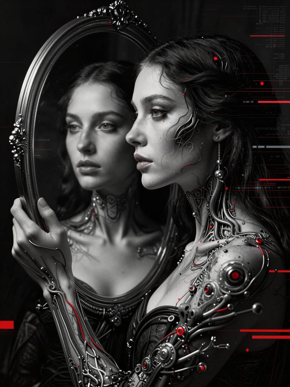 A hyper-realistic portrait shows a woman seeing her digital self in a mirror. Biomechanical and Renaissance art styles blend with stark lighting and crimson accents.