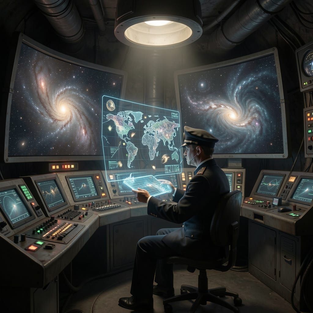 This image showcases a hidden control room with a lone figure monitoring cosmic data on blinking consoles and large screens. It features a dark academia and retro-futurist style with dramatic lighting.